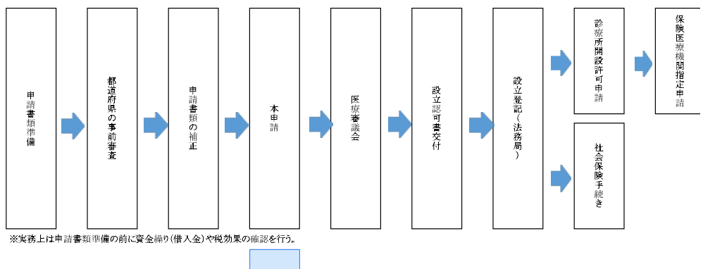 なお、設立認可後も、設立登記(法務局)、診療所開設許可申請(保健所)、保険医療機関指定申請(厚生局)、社会保険(健康保険、厚生年金)の切替・加入手続きなどの手続きがあるため、医療法人化が完了するまでは相応の期間を要することとなる。